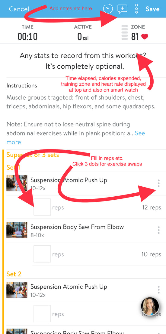 While doing a workout, you can fill in your reps/time, swap an exercise by clicking on the 3 dots, add notes, view time elapsed, add additional sets, etc. If you have a smart watch connected, you can view your active calories, heart rate and training zone. If connected to an Apple Watch, all data will sync to the health App. I recommend logging as much information a possible for future reference when viewing data and reports over time.