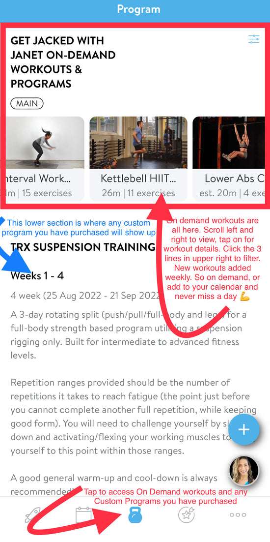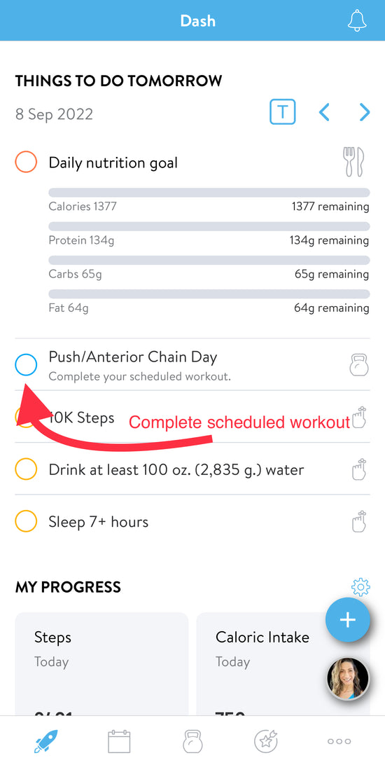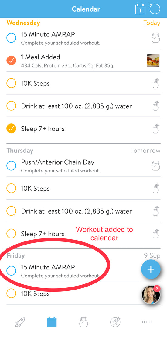 If you purchased a custom program, or are in a current challenge, your workouts are already scheduled for you and show up in the lower portion of the screen.