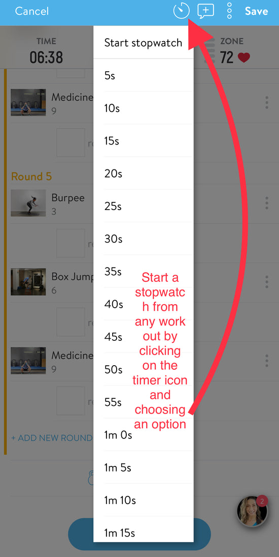 To start a stopwatch while doing a workout, if needed, simply tap the timer icon at the top and select from the dropdown list.