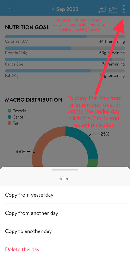 After tapping on your meals from the dashboard for a selected day, first swipe left, then you will see this screen where you can copy an entire day to or from another day.