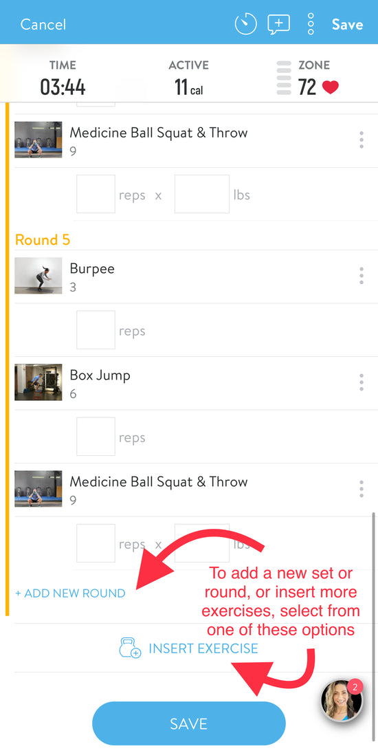 To add a new set or round to your workout, select one of the two options at the bottom of your screen.