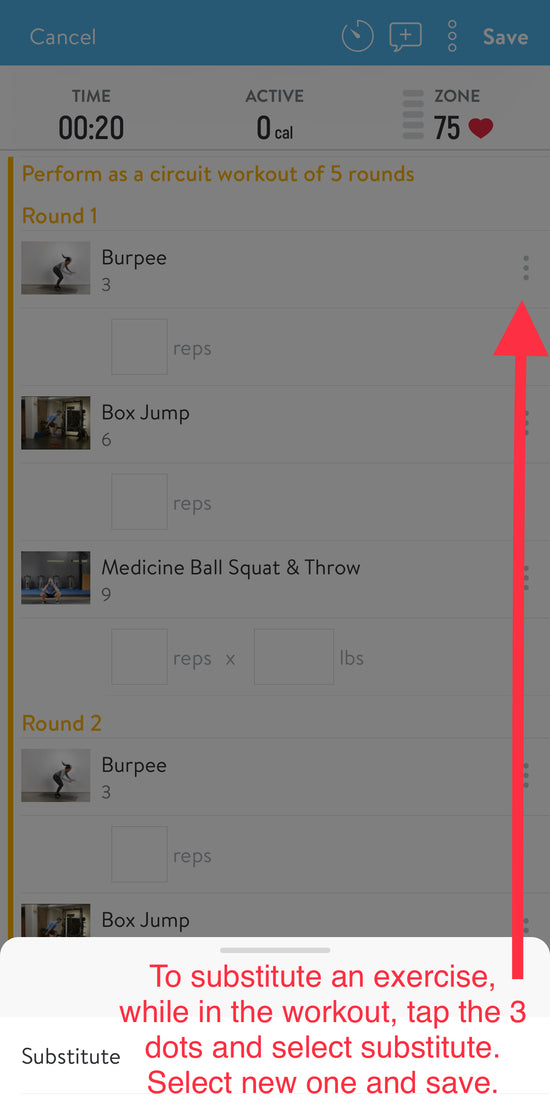 To substitute an exercise while in the workout, simply tap on the 3 dots next to the exercise, select a new one and save.