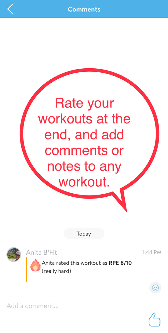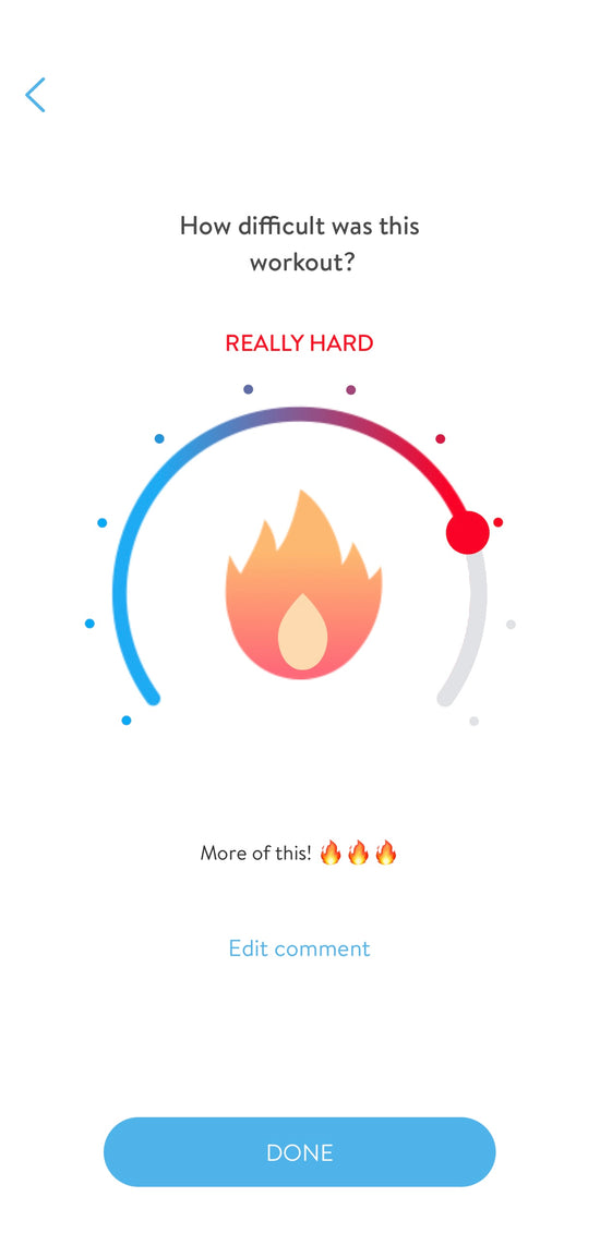 You will have the option to rate your workouts once you tap save or complete your workout. You can rate the difficulty of your workout, and also have the option to leave a comment.