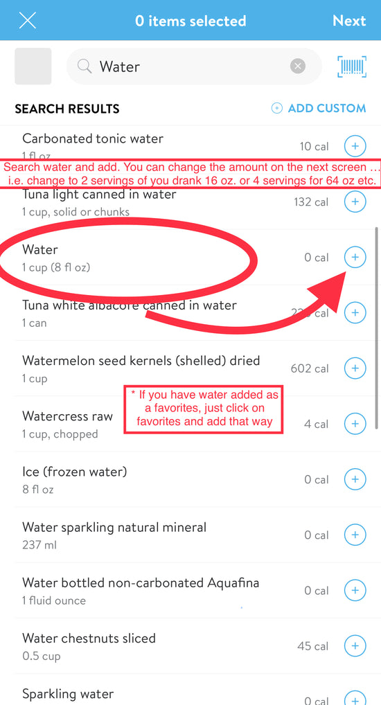 If you've added water to your favorites, you can just tap "Favorites" at the top and add.