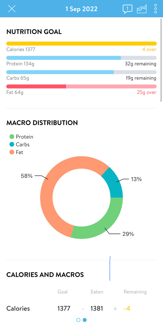 After tapping on your meals from the dashboard for a selected day, first swipe left, then you will see this screen where you can view calories, macro distribution, and other nutritional data like vitamins, minerals, caffeine, water, sugar, fiber and more.